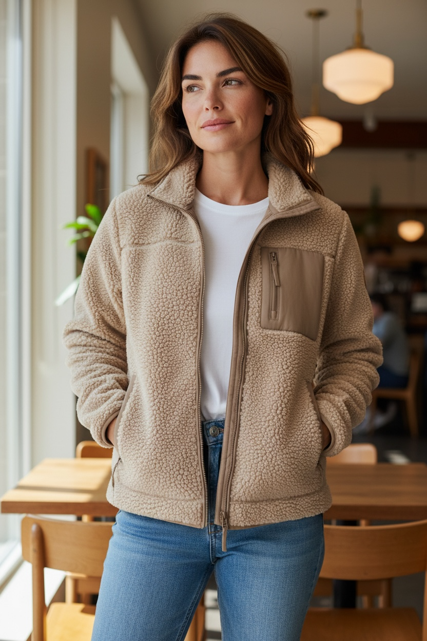 - Dubbelzijdige sherpastof met ton-sur-ton fleece aan de binnenkant.